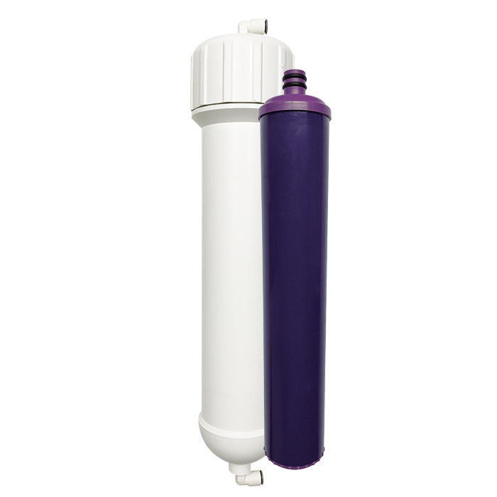 Sistema alcalino conexión rápida 1/4". Convierte el agua de ósmosis inversa en agua alcalina, restaurando el pH natural de nuestro cuerpo, al proveer un pH entre 8.5 y 9.5 ayudando con esto a neutralizar el exceso de acidez. Opcional para sistema de ósmosis inversa residencial.