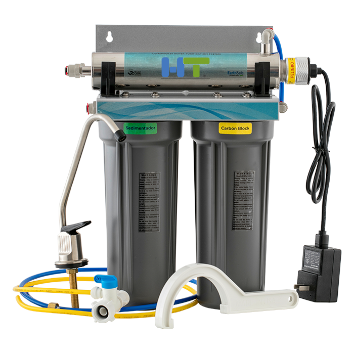Agua 3 veces más limpia y segura para tu familia. El sistema HT-1 (disponible en color azul y gris) utiliza los rayos ultravioleta para la desinfección y esterilización del agua, es uno de los sistemas más completos y eficientes que se han desarrollado para la purificación del agua, ya que los microorganismos, son expuestos a poderosas ondas de rayos ultravioleta, eliminándolos hasta en un 99% por completo, sin necesidad de usar productos químicos. El consumo de agua producida por el sistema de purificación por rayos uv, es totalmente seguro para el consumo humano. Remueve sólidos suspendidos en el agua.Elimina olor, color, sabor y cloro. Destruye microorganismos patógenos presentes en el agua.